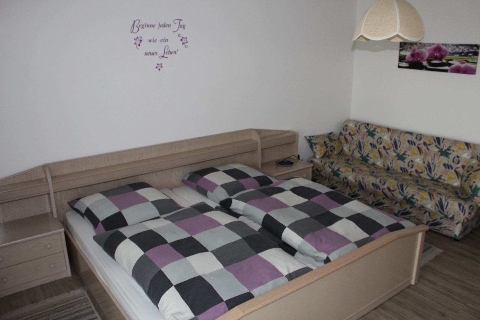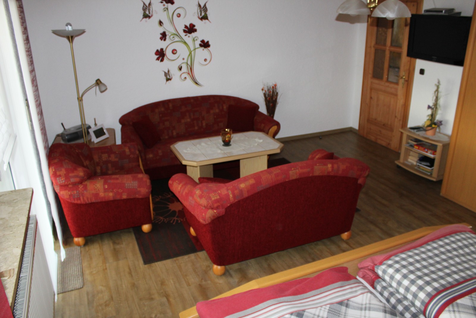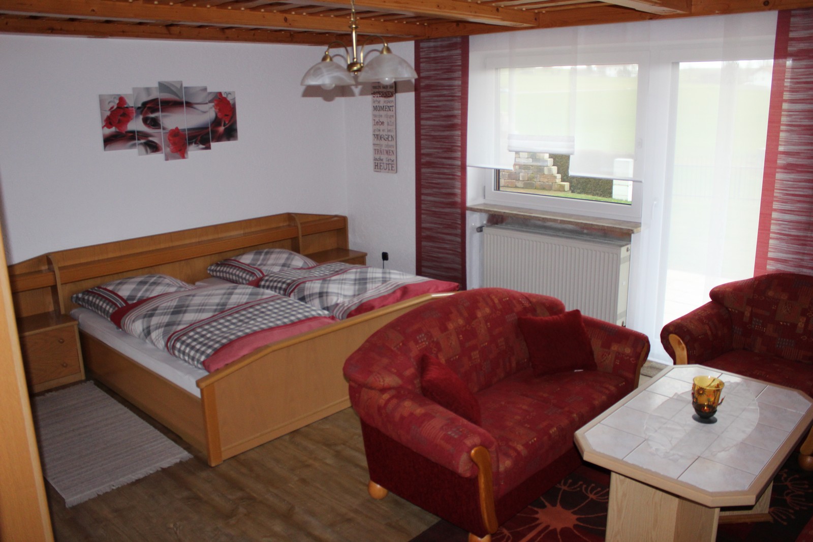 Im gemütlichen Wohn- Schlafzimmer befindet sich ein TV-Gerät mit Sat-TV.